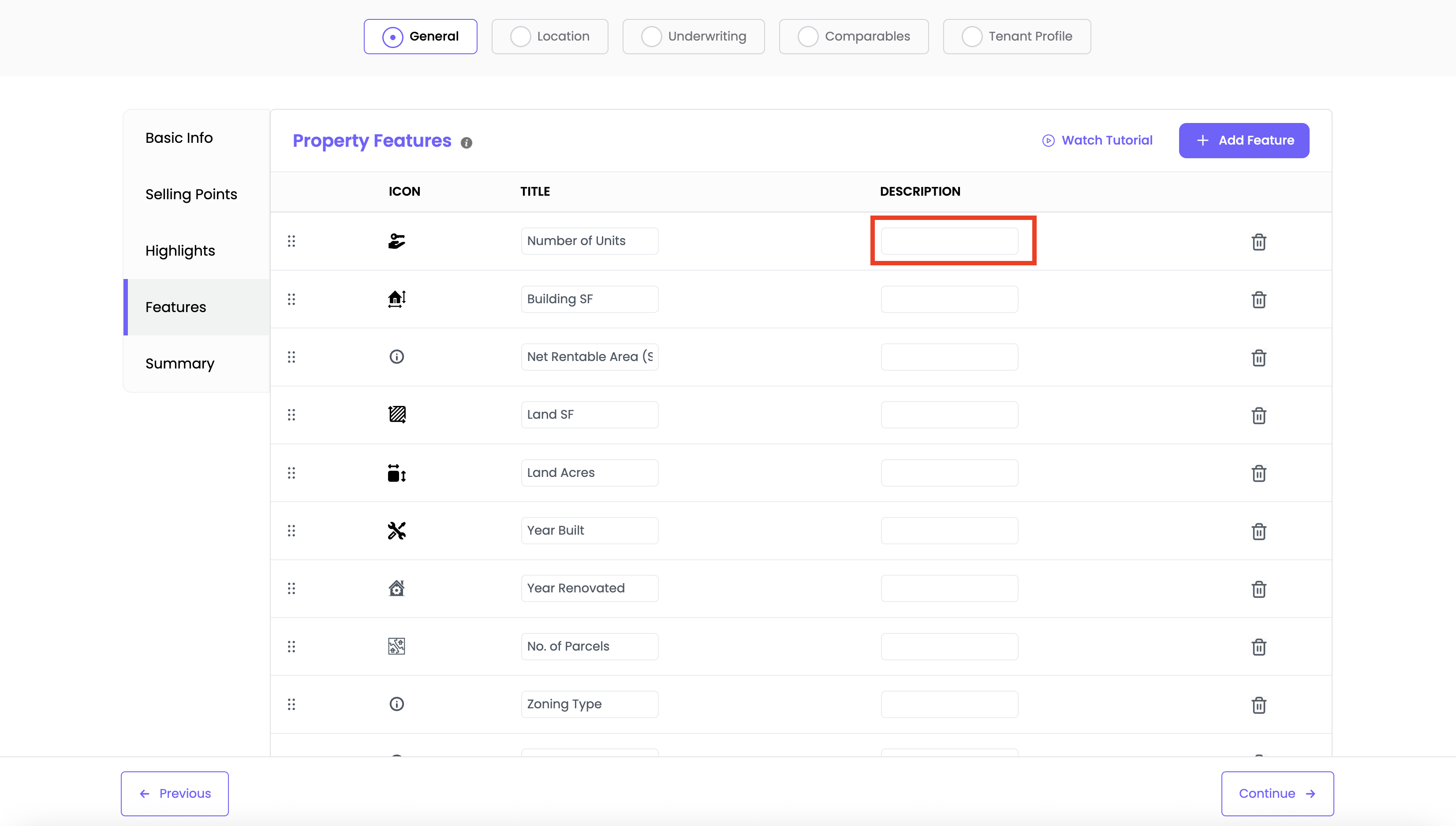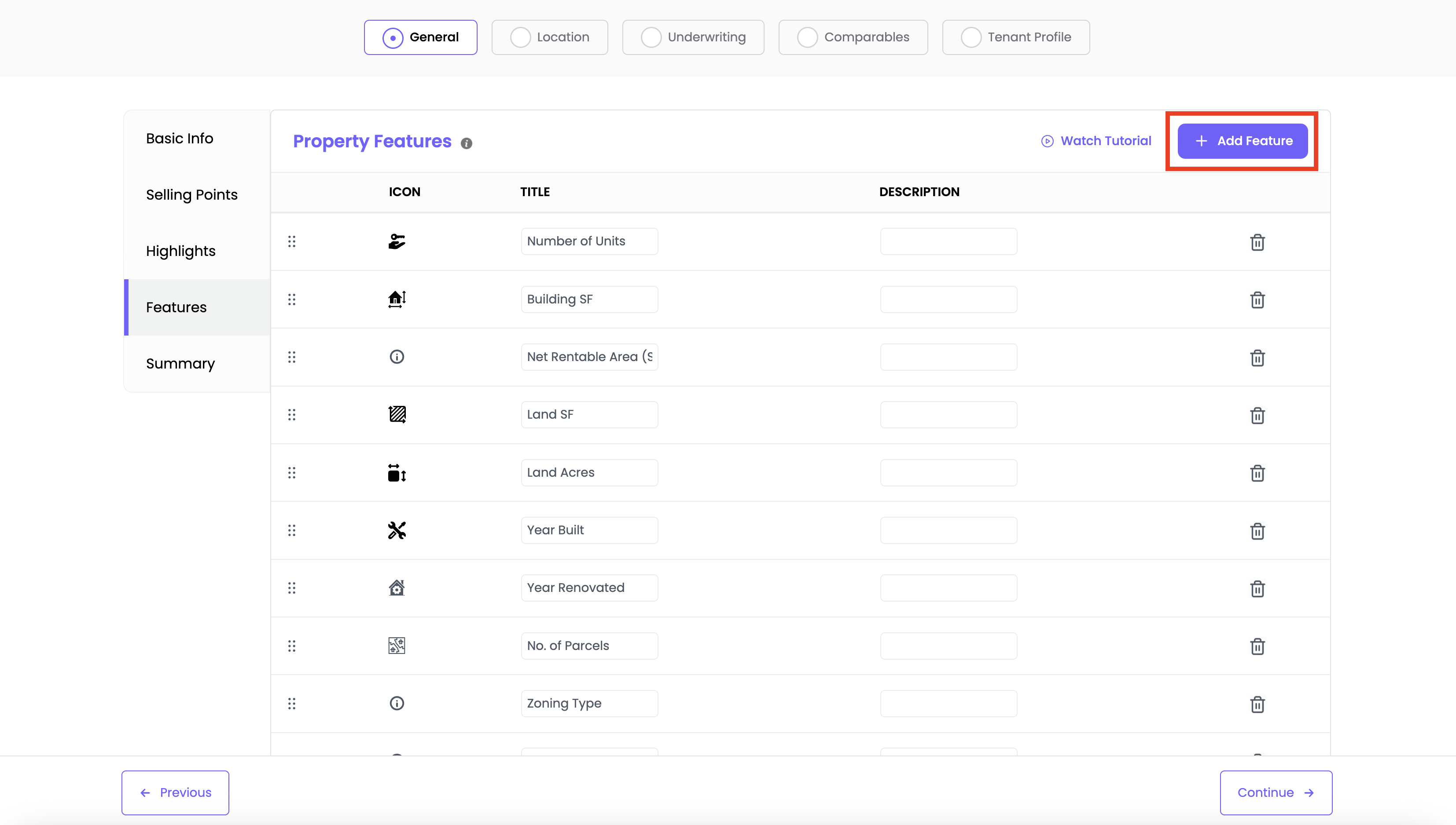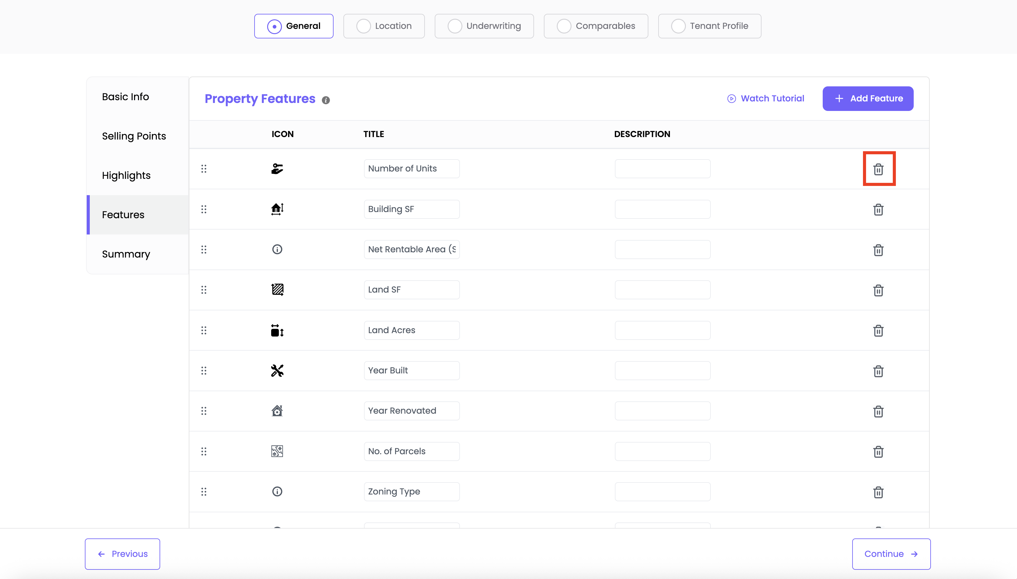 To delete a feature, click the trash icon next to it
