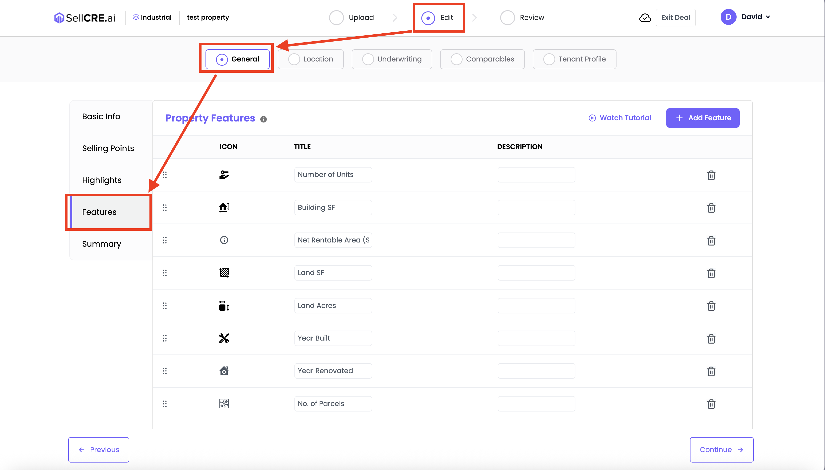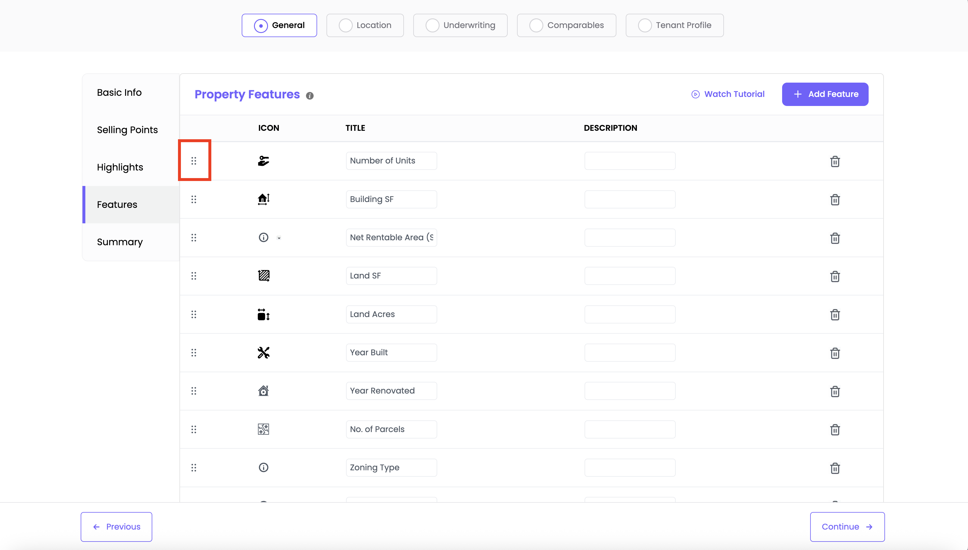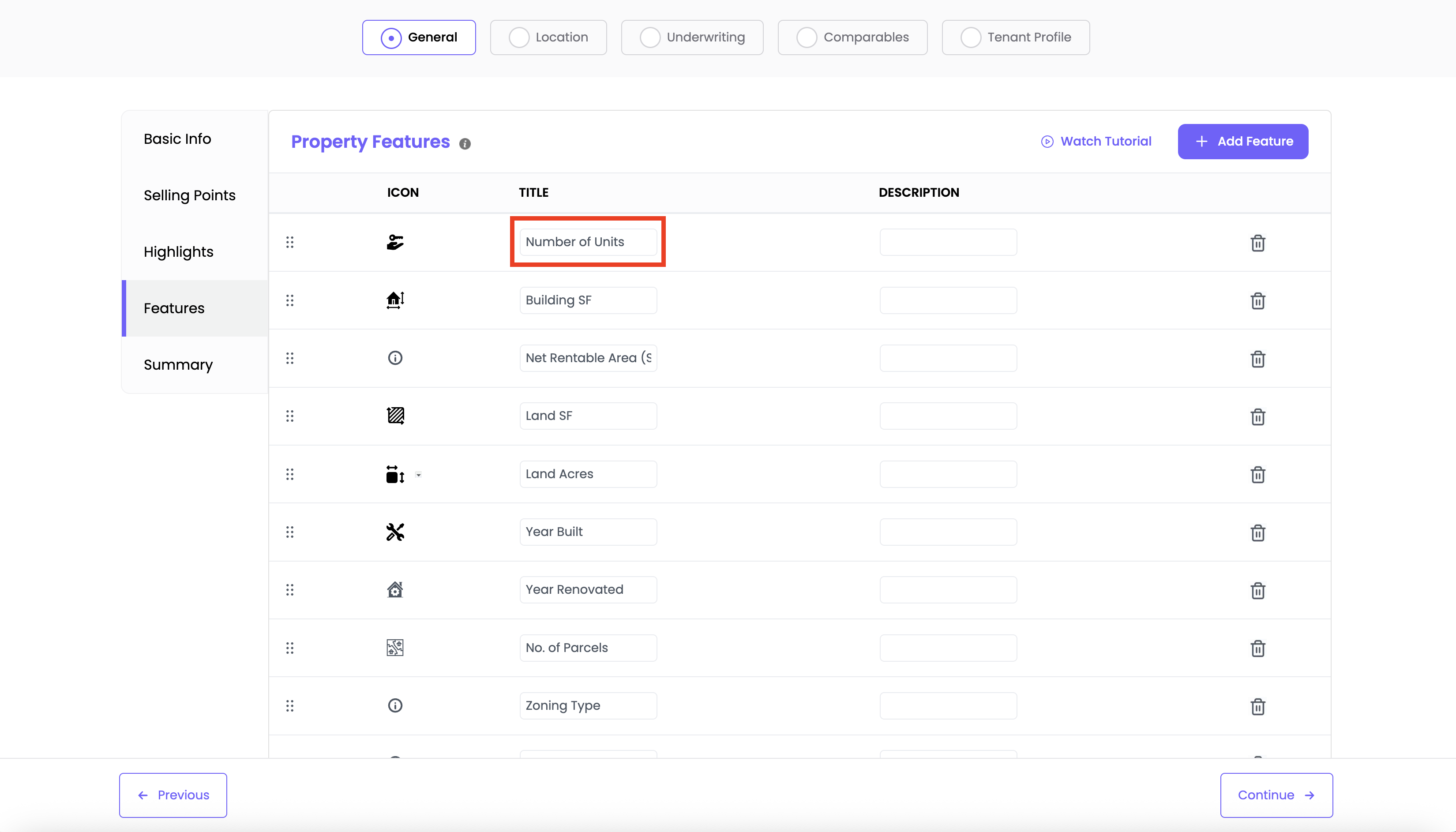 To delete a feature, click the trash icon next to it