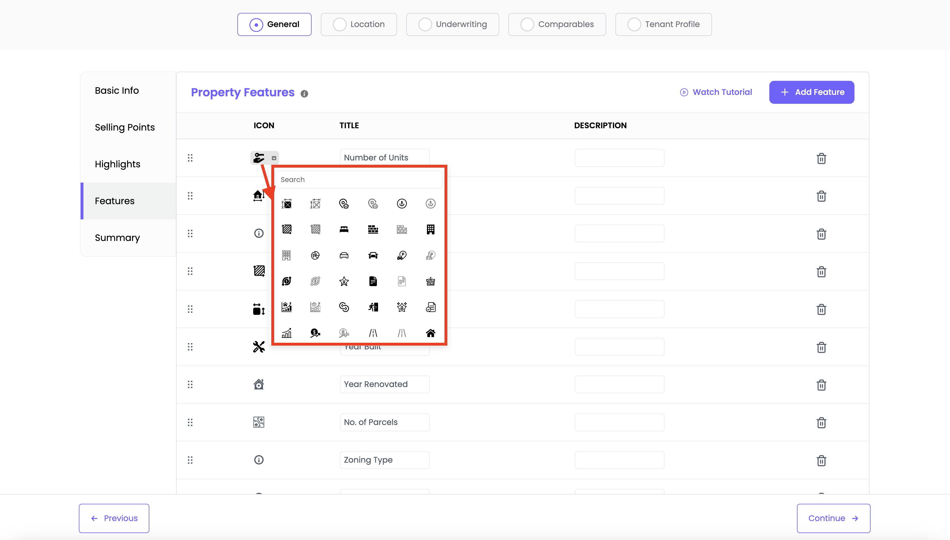 Choose an icon from the icon dropdown to visually represent the feature