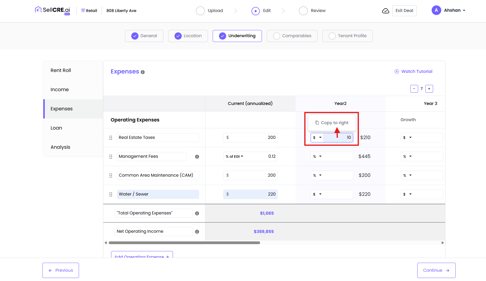 - Click on a cell to reveal the “Copy to Right” button — it lets you instantly apply the same growth rate across all future years for that expense.