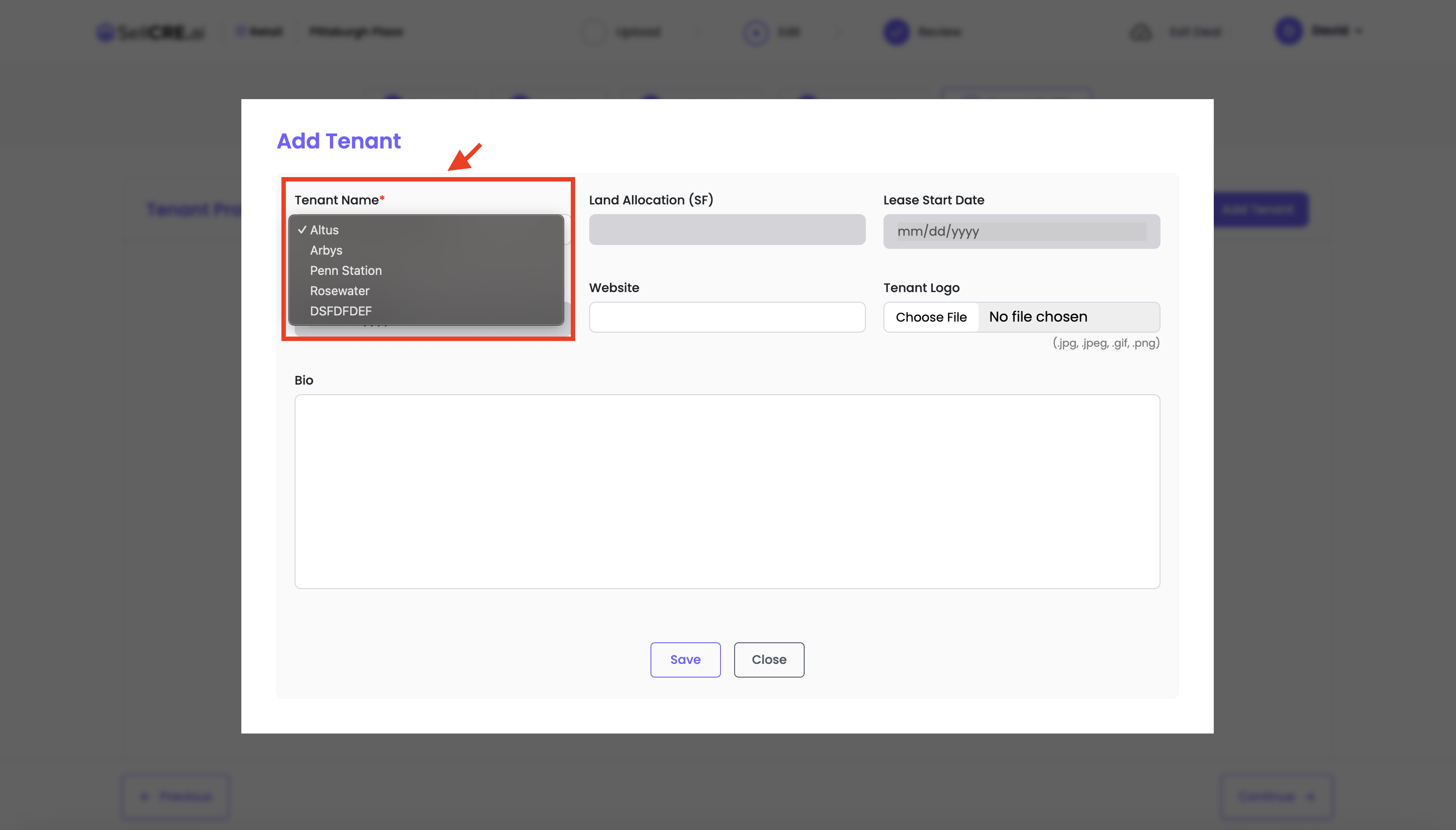Fields like Lease Start, Lease End, and Square Footage will be auto-filled and locked for consistency