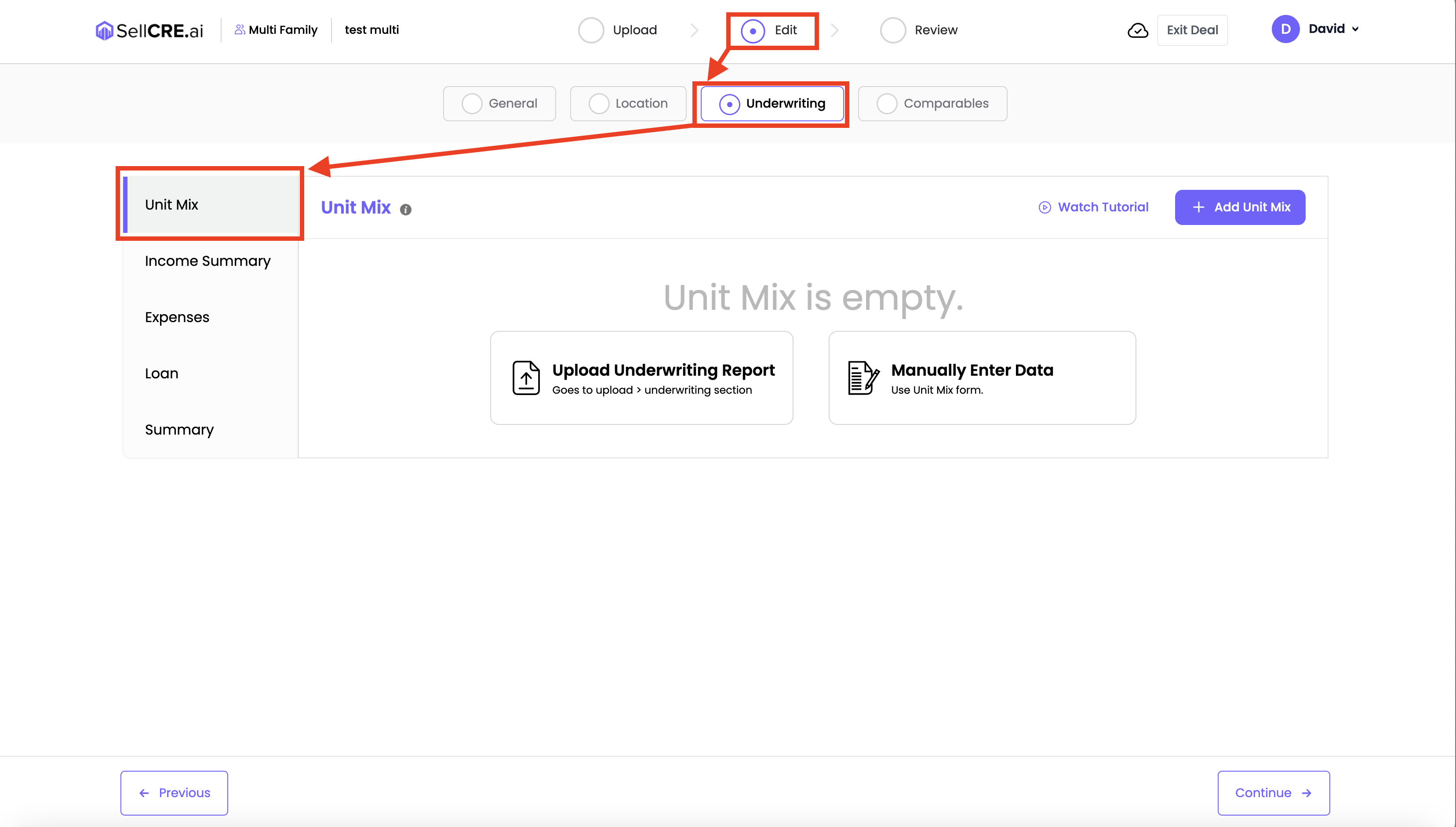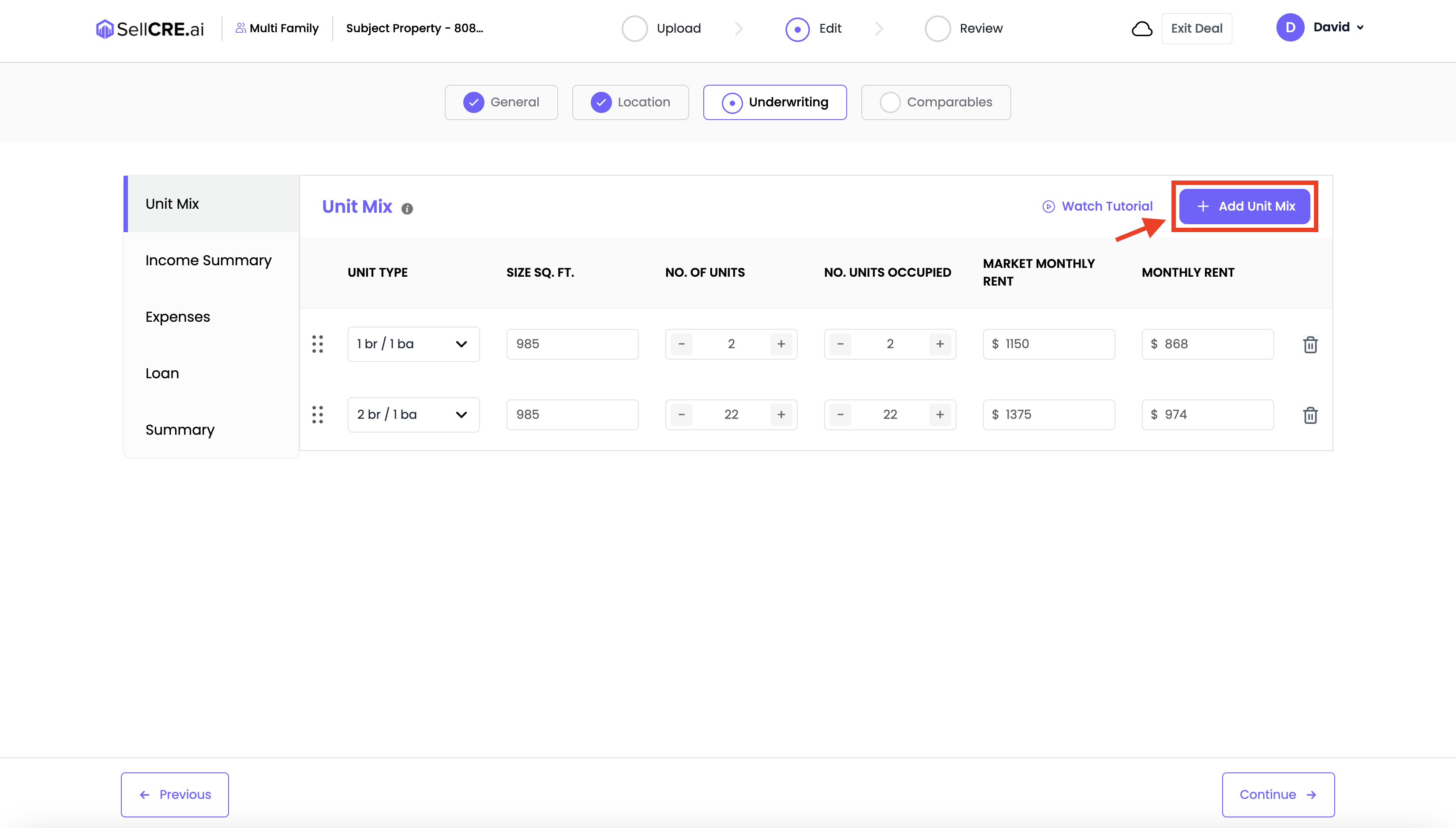 If you previously uploaded an underwriting report, the unit mix data you entered in the sheet will automatically appear here. You can still edit or update any of the rows if needed.
